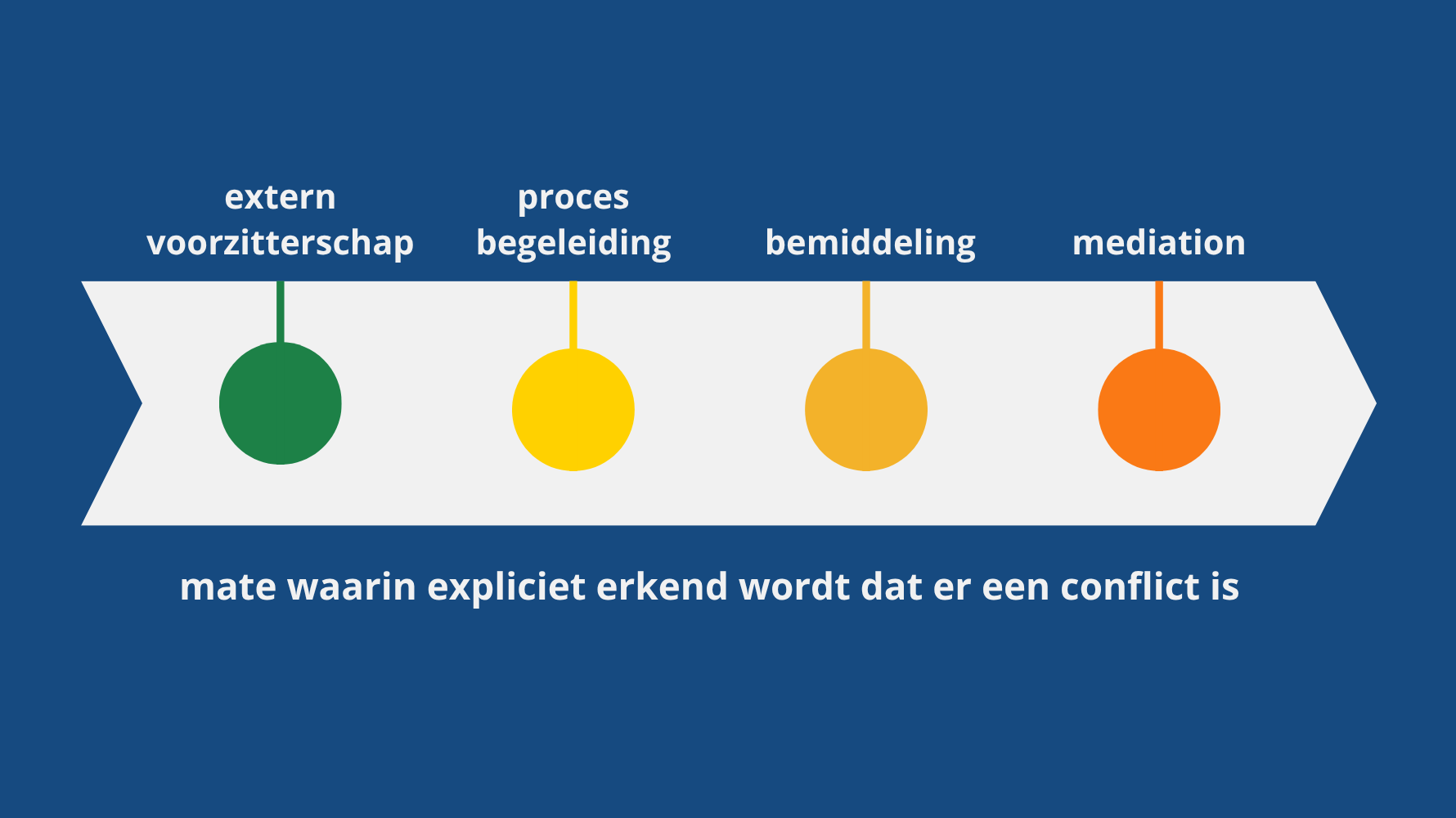 Waar past mediation binnen SOM? Binnen SOM zijn er verschillende manieren waarop een derde partij het gesprek tussen betrokkenen kan begeleiden. Denk aan onafhankelijk voorzitterschap, procesbegeleiding, informele bemiddeling en – als het echt spannend wordt – mediation. Op dit spectrum is mediation de interventie waarbij het conflict expliciet wordt erkend, de partijen aangeven er zelf lastig uit te komen met elkaar en waarbij het oplossen van het onderlinge conflict centraal staat in plaats van een specifieke (maatschappelijke) opgave waar een partij voor aan de lat staat. Al kan het conflict natuurlijk wel met deze opgave te maken hebben.
