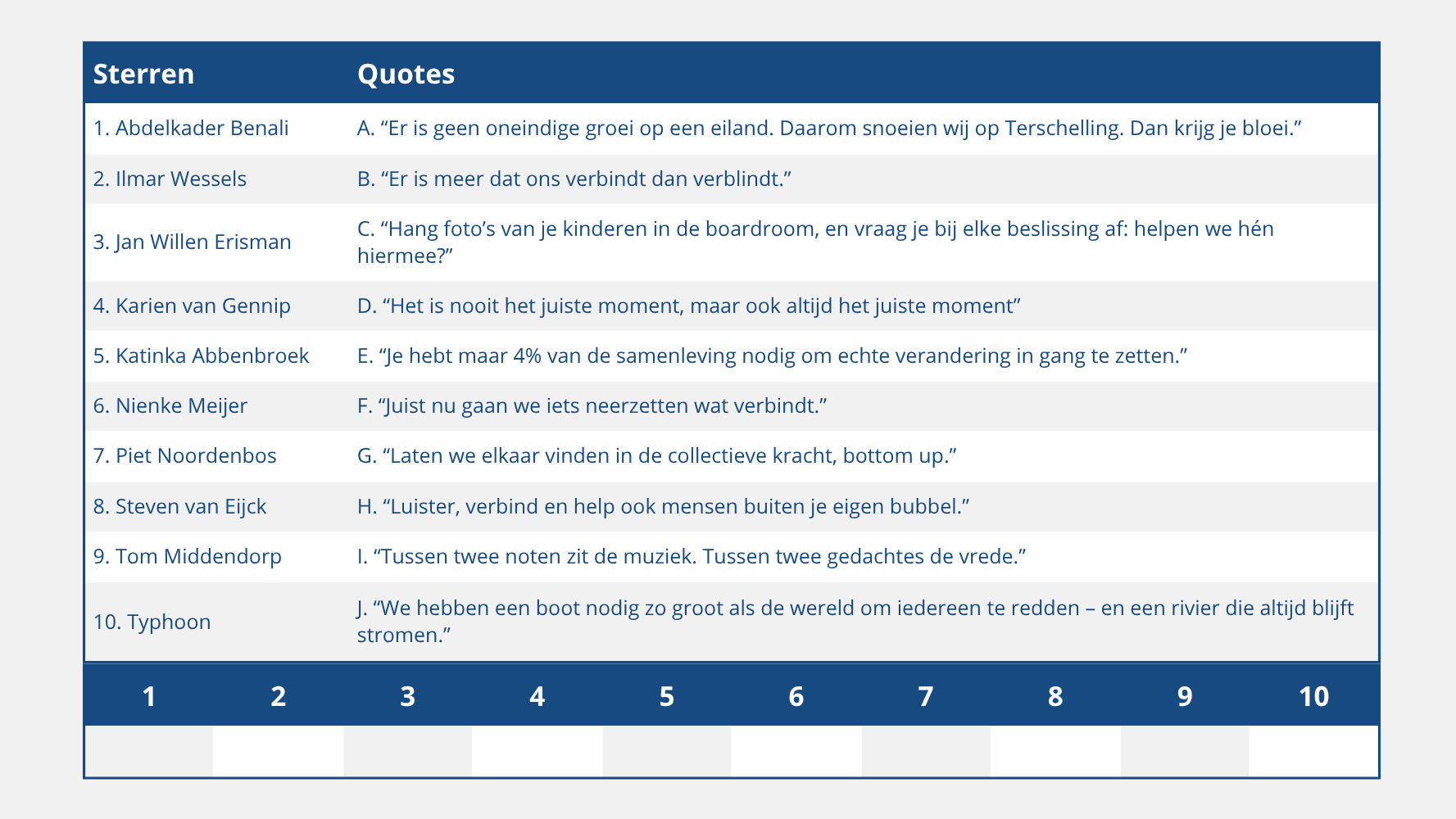 Prijsvraag Omdat ik mijn enthousiasme voor Springtij en haar sprekers graag deel met een groter publiek heb ik een prijsvraag. Denk je te weten welke ‘sterren’ de onderstaande uitspraken hebben gedaan op het Springtij Forum? Stuur dan de oplossing naar info@wesselinkvanzijst.nl. Ik mag onder de juiste inzendingen Typhoon’s boek "Liefde is de baas, De kunst van moedig leven," verloten.